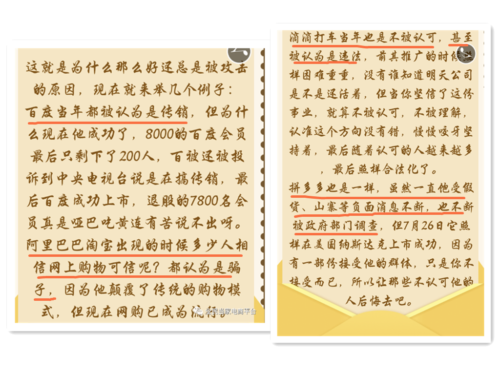 此外,该信中还以百度当年被认为是传销以及阿里巴巴当年被认为是骗子、滴滴打车当年不被认可、拼多多假货、山寨等负面消息不断例子进行对比引导。