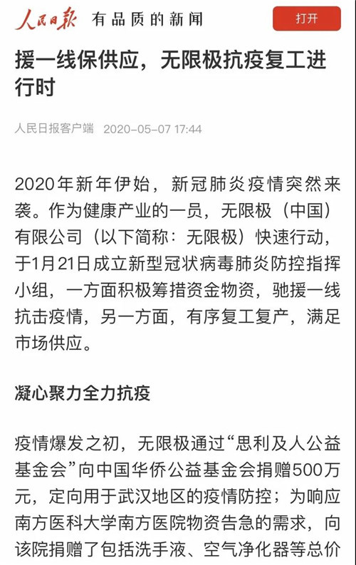 疫情爆发之初,无限极通过“思利及人公益基金会”向中国华侨公益基金会捐赠500万元,定向用于武汉地区的疫情防控;为响应南方医科大学南方医院物资告急的需求,向该院捐赠了包括洗手液、空气净化器等总价100万元的物资,为广东地区疫情防控尽一份力。