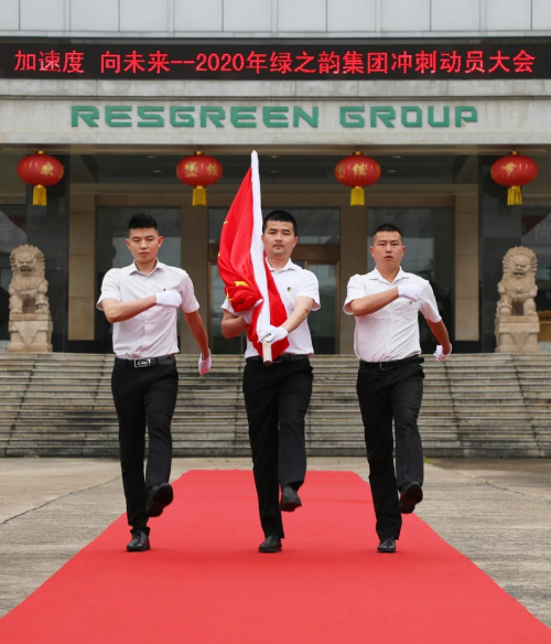 一曲激昂澎湃的《绿韵飞扬》拉开了动员大会序幕。在集团公司前坪,全体绿之韵人统一着装、整齐列队迎接升旗仪式暨动员大会。伴随着庄严雄壮的国歌声,鲜艳的五星红旗冉冉升起,绿之韵家人向国旗行注目礼,内心激荡着对伟大祖国的热爱和崇敬。