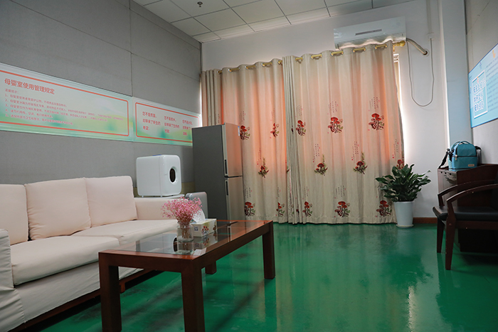 走进母婴室,简洁明亮的装修风格营造出一种温馨舒适的氛围,室内配备空调、冰箱、沙发、消毒柜、安洁空气净化器等物品,为哺乳期妈妈创造了一个温馨、愉悦、私密的休息场所。