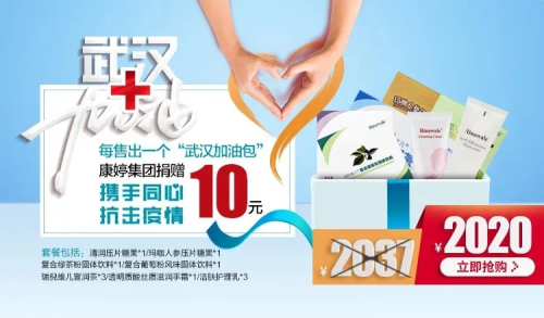 爱心再续,2月底康婷云生活APP平台特别推出“武汉加油”产品套组,自2020年2月28日至2020年4月30日止,每售出一套“武汉加油”产品套组,康婷集团将捐出10元善款,涓涓细流汇聚成爱心之河,源源不断地流向武汉抗疫一线。