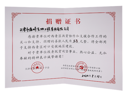 康婷集团于2020年4月再次捐献善款人民币5万元,用于支持西青区对口受援地区建设。