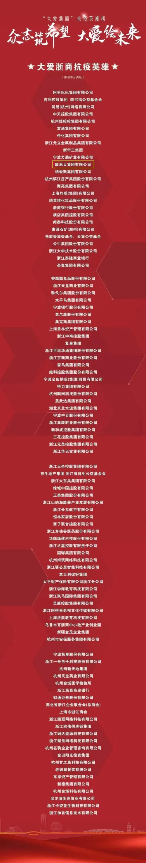 众志筑希望 康恩贝登“大爱浙商抗疫英雄”榜单