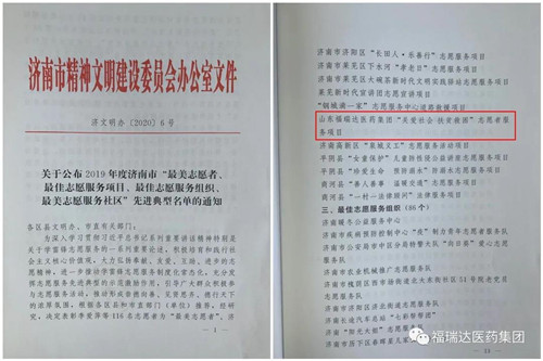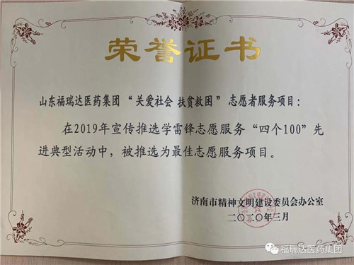 近期,福瑞达医药集团“关爱社会、扶贫救困”志愿服务项目在2019年度宣传推选学雷锋志愿服务“四个100”先进典型中,被推选为“济南市最佳志愿服务项目”。