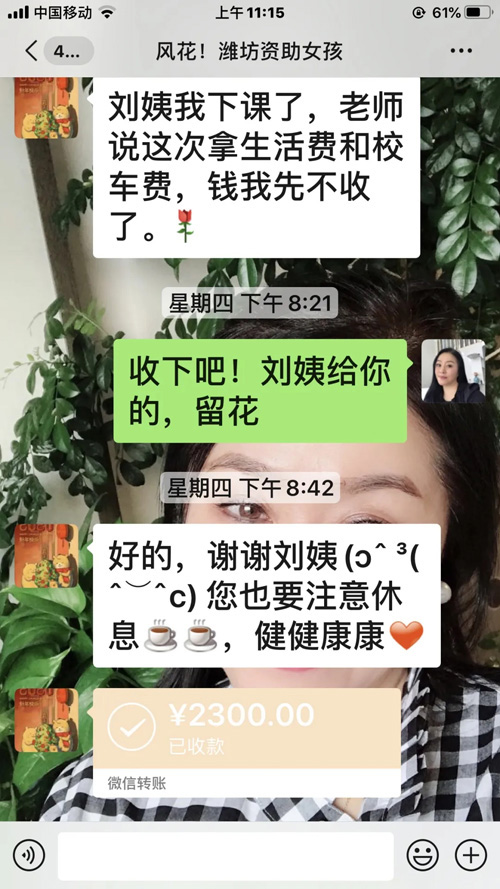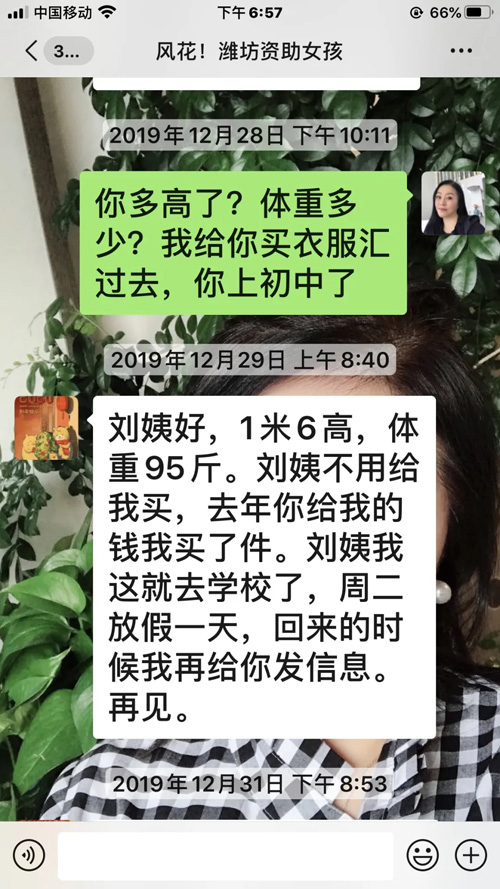 2018年末,尚赫品牌经营人刘桂香女士援建了第179所尚赫公益小学——山东省昌乐县鄌郚镇北鄌郚尚赫刘桂香小学。自此,孩子们成了她心头的一份牵挂。当年,她走进一个孩子的家庭,建立起一对一援助,嘘寒问暖,关怀备至。从第一次倾注关怀目光到今天一援助就是第三个年头。如今,女孩儿已经初长成,她又想着帮助孩子添置新衣,买新学习用品。