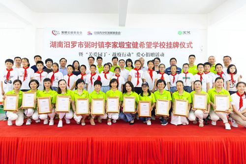 6月10日,由宝健公益基金会捐资100万元援建的湖南省汨罗市弼时镇李家塅宝健希望小学举办挂牌仪式。汨罗市当地政府机构领导、北京经济开发区管委会有关领导、宝健公司及所属宝健公益基金会、宝健1%爱心志愿者代表共同出席活动,关心慰问学校疫情防控和师生复课复学情况,并为学校师生送去内含口罩、洗手液、牛初乳、维生素C等物品的“健康公益包”。