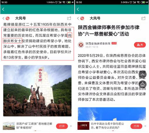 当地也有企业为瓦屋庄尚赫庆彬小学的孩子们送去了物资,并报道了因为姚庆彬女士的投资捐助,解决了这个地处大山深处的村子的教育难题,为这里的孩子们带去了阳光与希望。