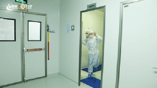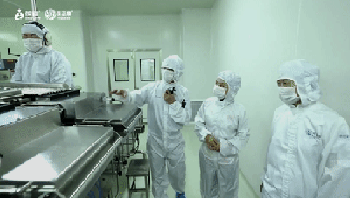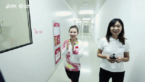 跟随着工作人员的脚步,何可欣经过洗手、消毒、更衣更鞋等一系列严格的程序后,终于来到了产品生产车间,这时何可欣也变身成为好奇宝宝,认真观察着每一个生产环节。