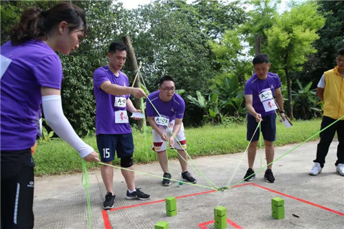 团队所有成员手拉绳子,通过配合协作使不规则的木头累积达到5层的高度才算成功。打好根基是这个游戏的关键,不急不躁,默契配合,才能循序渐进地层层向上。