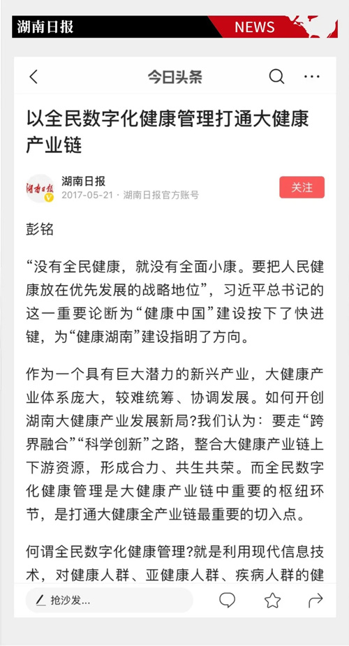 在全面建成小康社会的冲刺关头,我们应如何以《“健康中国”2030规划纲要》为指引,全力推进“健康湖南”建设?《湖南日报》特邀绿之韵健康科技总裁彭铭建言献策,在理论智库版重点刊发彭铭总裁撰写的理论文章《以全民数字化健康管理打通大健康产业链》,文中提出的“以全民数字化健康管理为切入点,推动健康产业大发展”的策略建议,引起政府和社会各界广泛关注。