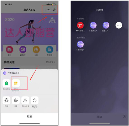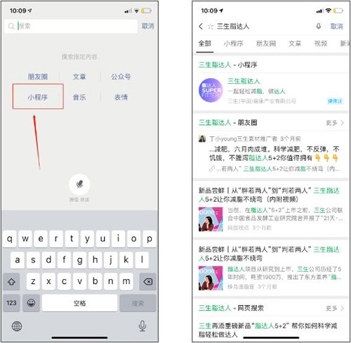 点击微信主界面上面的搜索栏,指定“小程序”类型,输入“三生脂达人”关键字