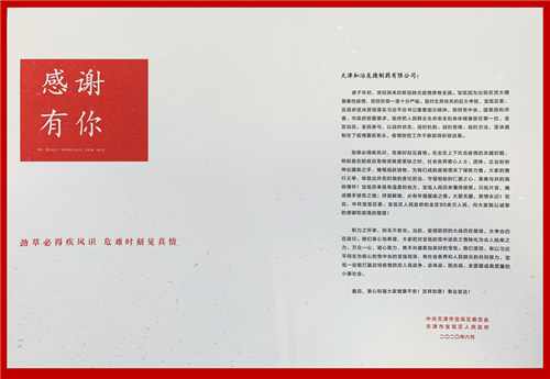 近日,天津和治友德制药有限公司收到中共天津市宝坻区委员会、天津市宝坻区人民政府的感谢信。来信对和治友德公司在抗击新冠肺炎疫情关键时期做出的善行义举表达诚挚的感谢,对和治友德公司体现出的共克时艰的责任担当、守望相助的仁爱之心、患难与共的高尚情怀给予高度评价。