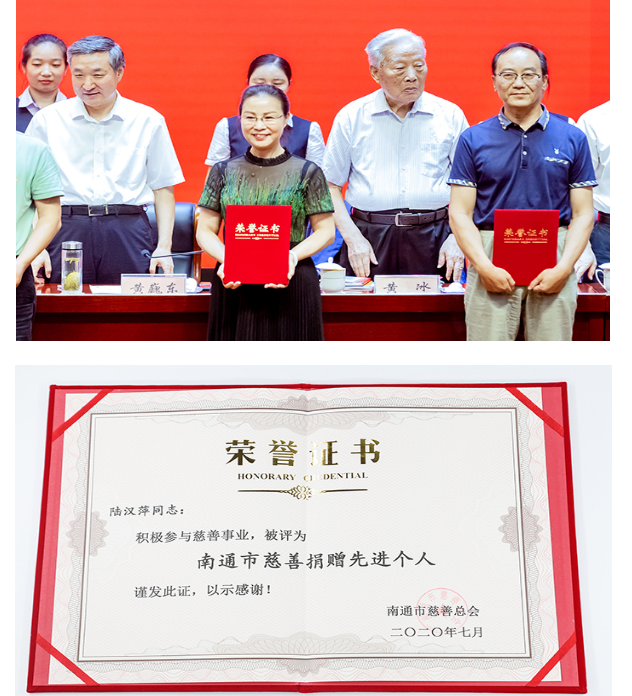 7月27日上午,南通市慈善总会第五届会员大会暨全市慈善工作会议在市行政中心报告厅召开。会议表彰了市慈善总会第四届理事会期间慈善先进单位、先进个人和优秀项目。安惠公司凭借多年来对公益慈善事业的贡献,荣获“南通市慈善志愿服务先进单位”;安惠公司副董事长陆汉萍获得“南通市慈善捐赠先进个人”称号。
