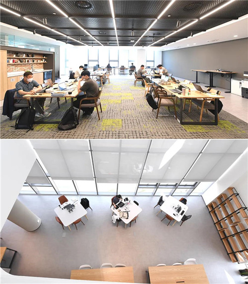 圃美多技术院的3层是包括智能办公在内的社区空间。智能办公是早晨上班的研究员可以自由安排位置进行业务的办公空间。该咖啡厅备有糖果机和咖啡机,此外还备有可以边茶点边进行活跃沟通的开放空间和设有隔板的集中办公室。为了沟通全球市场,这里还设置了4个可以进行尖端视频会议的视频会议室。