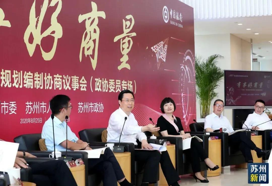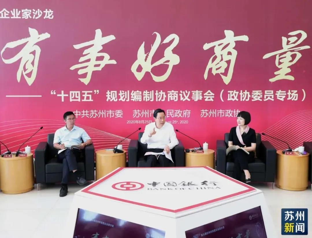 2020年8月25日上午,苏州市第九期民营企业家沙龙与市政协“有事好商量”协商议事会在中国银行苏州分行联合举办。围绕高水平编制“十四五”规划,江苏省委常委、苏州市委书记蓝绍敏与20位民营企业家政协委员面对面深入互动交流,凝聚智慧力量,共同谋划苏州未来发展宏伟蓝图。