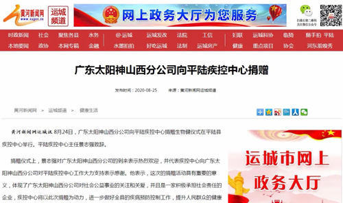 而太阳神此举也引起了当地媒体高度重视,黄河新闻网就以《广东太阳神山西分公司向平陆疾控中心捐赠》为题,给予了全面跟踪报道。