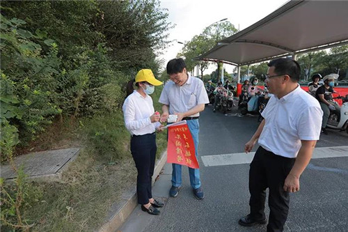 8月31日下午,安惠党建指导员、助企“第一书记”沈树新,安惠联合工会主席李士强先后来到通富路星湖大道路口、新开路上海路口,慰问在这里进行交通志愿服务的安惠江海志愿者,并为他们送去湿巾和矿泉水用于降暑。