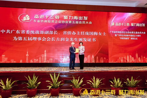 中共广东省委统战部副部长、省侨办主任庞国梅为广东省侨商会第五届理事会会长古润金颁发证书