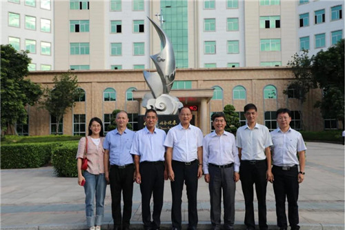 合影留念(左起:黎锦祥副总裁、李欣欣部长、高炜总裁、高茂林常务副会长、高益槐教授、何方明副会长、林衍铨所长、郑春源总监)