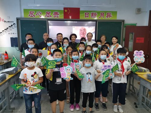 活动现场,天津市武清区大良镇尚赫宋娟小学师生代表与尚赫公益基金会理事长陈以勳进行“云连线”