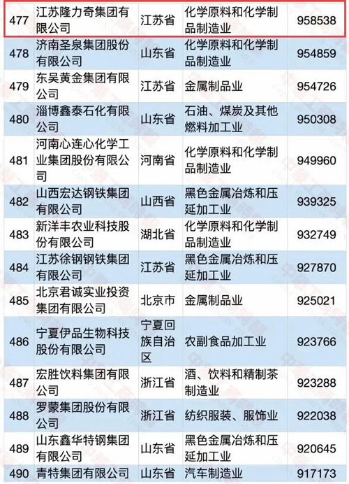 隆力奇跻身2020中国民营企业制造业500强