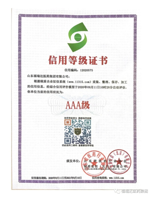 近日,福瑞达医药集团顺利通过山东省医药行业协会和第三方权威征信机构的审核,获得AAA级企业信用等级证书。