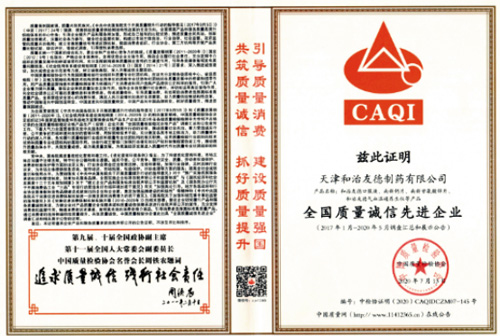 在2020年全国“质量月”活动中,天津和治友德制药有限公司被评为全国质量诚信先进企业;和治友德品牌被评为全国医药行业质量领先品牌;公司核心产品和治友德口服液、南新钙片、南新甘氨酸锌片、气血温通养生仪等产品被评为全国质量检验信誉保障产品。获得多项殊荣,正是企业长期以来坚持质量为本,关注产品品质的成果体现。