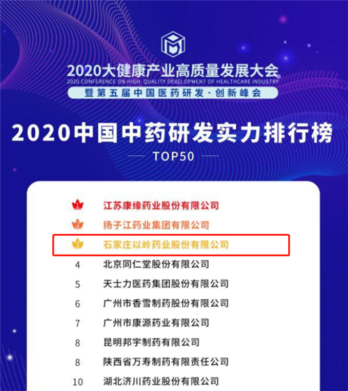 以岭药业荣登中国中药研发实力排行榜第三名