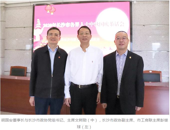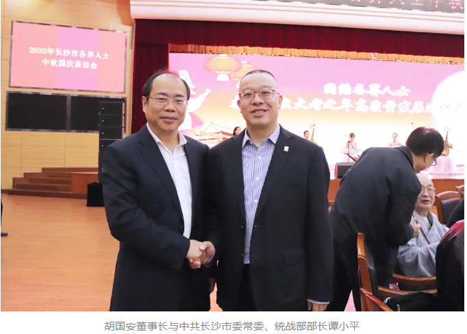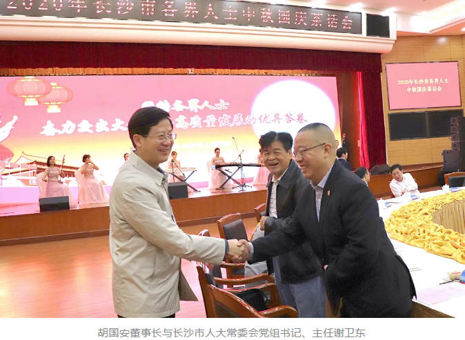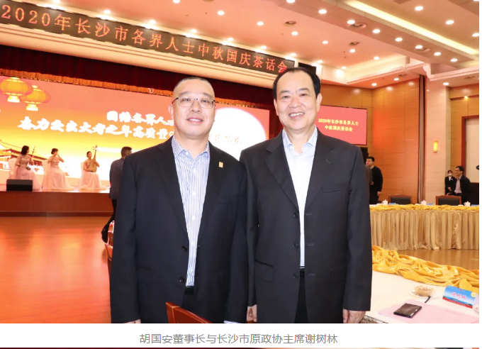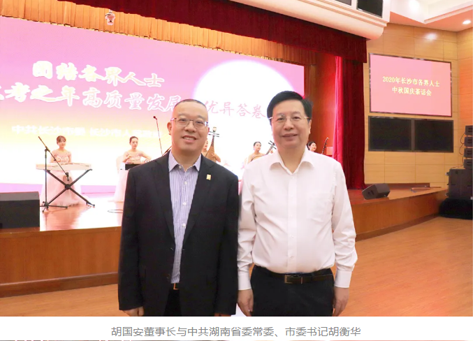 2020年9月28日,由中共长沙市委、长沙市政府主办的2020年长沙市各界人士中秋国庆茶话会在长沙市会议中心召开。中共湖南省委常委、长沙市委书记胡衡华,长沙市人大常委会党组书记、主任谢卫东,长沙市政协党组书记、主席文树勋,中共长沙市委常委、统战部部长谭小平以及全市离退休老同志、各界人士共同出席活动。湖南省政协委员、香港长沙联谊会名誉会长、香港长沙商会常务副会长、绿之韵集团董事长胡国安受邀出席活动,与参会嘉宾欢聚一堂,共叙友情、共谋发展,共庆中秋佳节和中华人民共和国成立71周年。