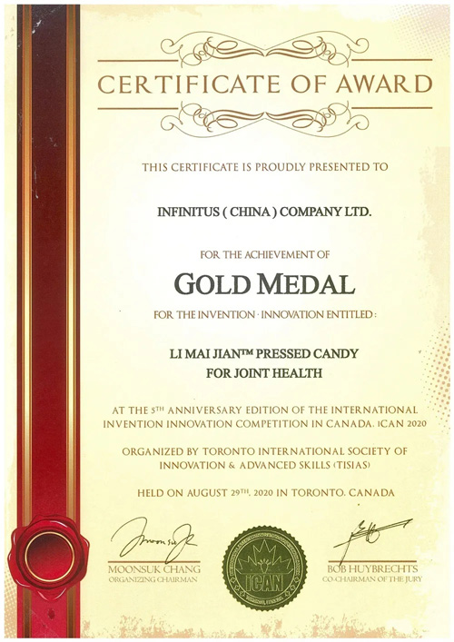 近日,在2020年加拿大国际发明创新竞赛(iCAN)中,公司自主研发产品“无限极牌立迈健压片糖果”凭借过硬的设计创新以及技术实力,斩获金奖和特别奖。