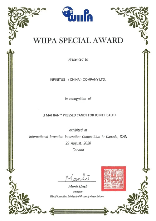 在本次竞赛中,公司以“LI MAI JIAN PRESSED CANDY FOR JOINT HEALTH”(立迈健压片糖果)为参赛主题,在线上展示中,通过文字及视频录制的方式,充分展现、阐述了立迈健的关节科学养护主张、生物控制酶解技术生产的软骨提取物、“补充+养护”的创新配方、与国内外顶级学校联合研究情况、不添加蔗糖的健康产品设计、粉末直压及透明包衣成型工艺、产品良好的服用体验以及市场价值等,产品获得评审团的高度认可,被授予金奖及特别奖。
