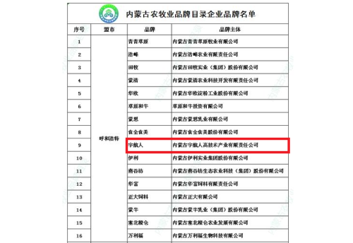 宇航人公司与伊利集团、蒙牛集团、正大集团等120家企业被收录为内蒙古农牧业品牌目录。