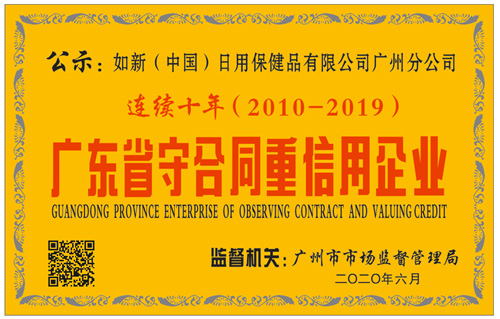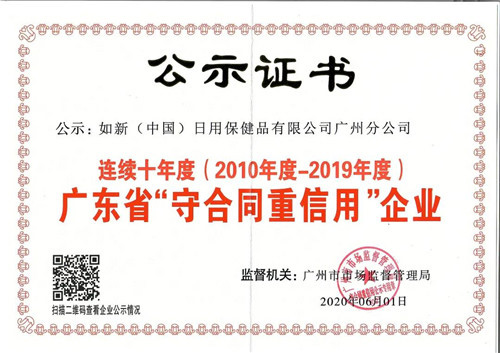 如新(中国)日用保健品有限公司广州分公司自2010年到2019年连续十年蝉联“广东省守合同重信用”企业称号。