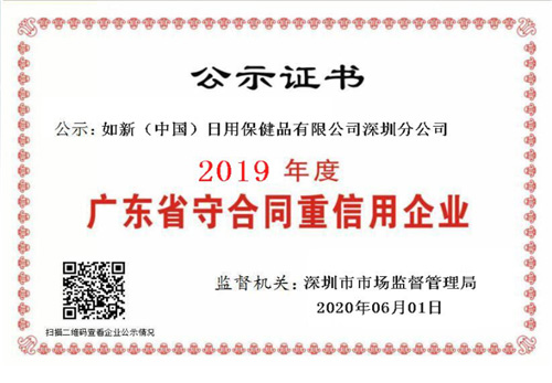 如新(中国)日用保健品有限公司深圳分公司自2014年到2019年以连续六年取得“广东省守合同重信用”企业称号。