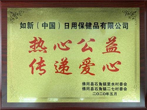 佛冈县石角镇里水村委会、二七村委会授予如新(中国)日用保健品有限公司广州分公司“热心公益传递爱心”牌匾。