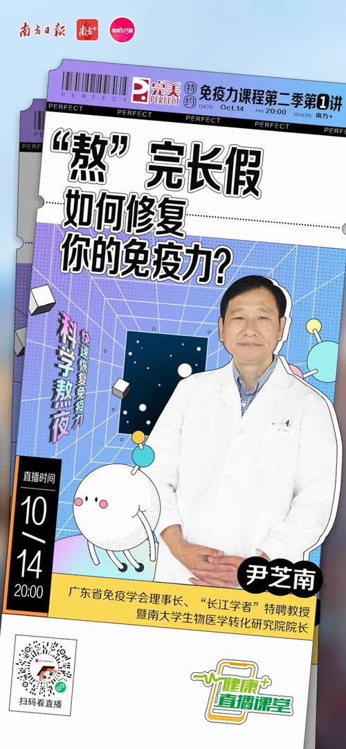 10月14日(周三)晚上8:00,暨南大学生物医学转化研究院院长、广东省免疫学会理事长、“长江学者”特聘教授尹芝南,为我们生动开讲免疫力的那些事儿。