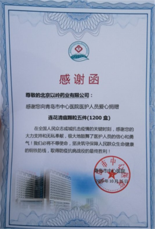 10月15日上午,以岭药业向青岛市红十字会捐赠12000盒连花清瘟颗粒,用于青岛市六家医院医护人员和中风险区居民对新冠肺炎的防控。青岛市红十字会对以岭药业的大爱精神给予高度评价。
