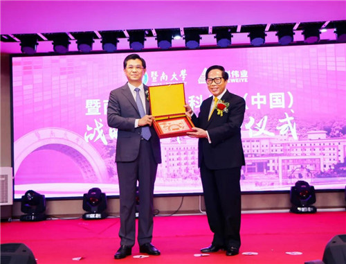 金科伟业(中国)冯柏乔董事长向暨南大学林如鹏书记回赠纪念品