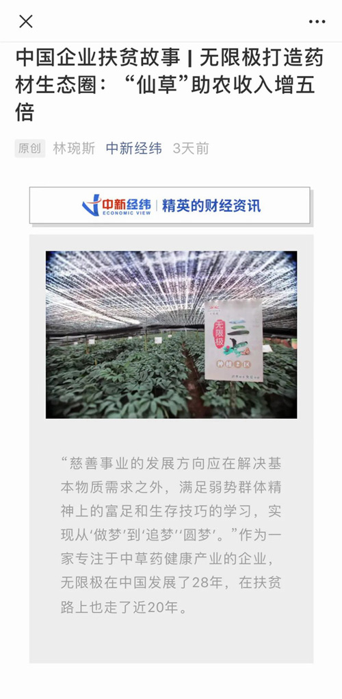 作为一家专注于健康养生产业的企业,无限极秉承“思利及人”的核心价值观,20多年来,以教育扶贫和产业扶贫为导向,走出了一条从帮扶个人到培育产业的扶贫道路,受到了财经新媒体中新经纬的关注和报道。