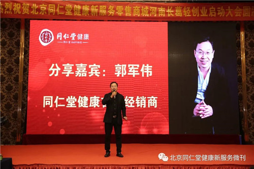 同仁堂健康优秀经销商代表郭军伟先生用河南当地本土话激情分享他不忘初心传播同仁堂351年文化的经历,他坚持用正念带动当地轻创业人士一起把握机会,共同创业,共同健康。