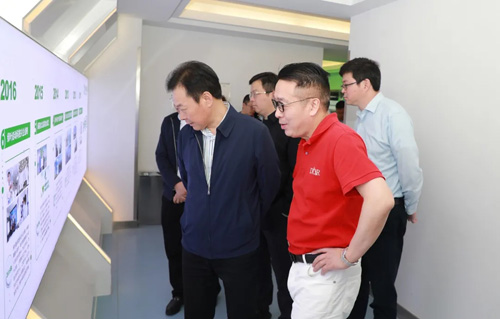 在企业发展历程展示板前,徐建成董事长详细介绍了绿叶九年来深耕中国日化领域,努力夯实产品研发与生产能力,并在疫情下果断战略升级,顺势推出绿叶购自主品牌连锁经营的发展过程。潘建华副市长对绿叶成立九年来的迅猛发展及绿叶的产品理念表示了高度的肯定。