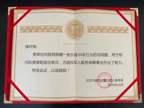 寒冬将至,绿叶购积极履行社会责任,向退役军人送温暖!今年是中国人民志愿军抗美援朝出国作战70周年,为弘扬伟大的抗美援朝精神,表达对抗美援朝老战士的崇高敬意,并参与营造“崇军荣军”“拥军爱军”的社会氛围,近日,绿叶购坚持践行企业社会责任,向北京市朝阳区抗美援朝退役老战士捐献“暖军衣”。一件件厚实又保暖的羽绒服满载着军民鱼水情,送到抗美援朝退役老战士手中。