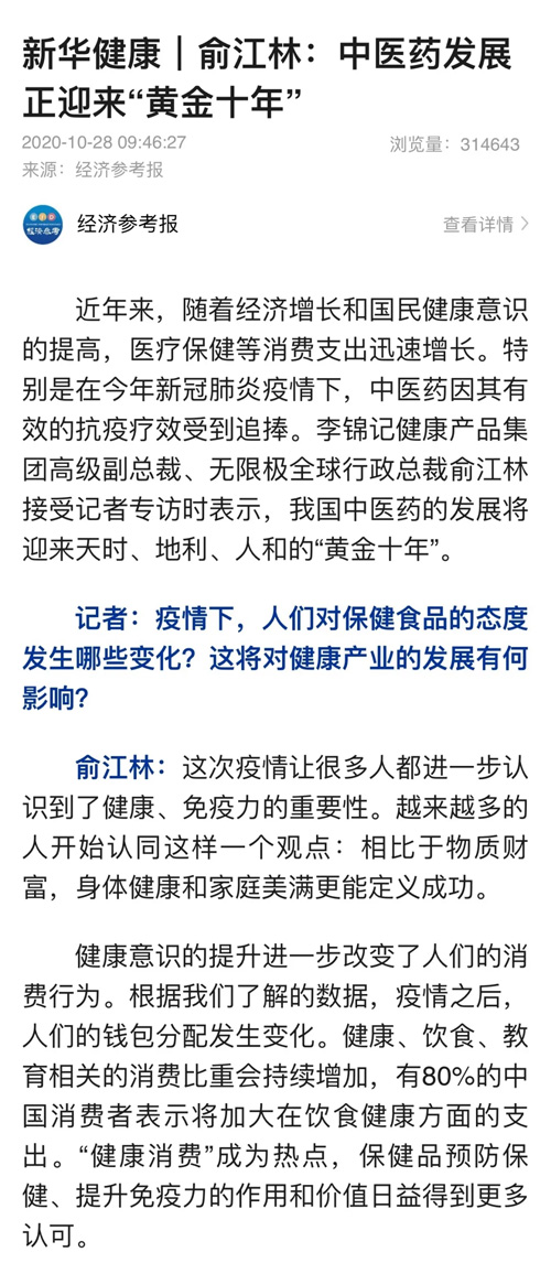 近日,李锦记健康产品集团高级副总裁、无限极全球行政总裁俞江林先生做客新华社,接受了《经济参考报》记者的专访。《经济参考报》、新华社APP发布了专访报道。