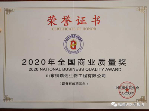 2020年11月1日,中国商业联合大会在北京隆重举行。根据《全国商业质量奖评审管理办法》(试行)有关规定,经企业自愿申报、各地商业主管部门和行业协会推荐,全国商业质量奖评审办公室初步形式审查,并依据国家标准《卓越绩效评价准则》(GB/Z19580—2012)和《卓越绩效评价准则实施指南》(GB/Z19579—2012)技术文件,组织专家评审及获奖名单公示,决定授予山东福瑞达生物工程有限公司(以下简称福瑞达美业)等126家单位“2020年全国商业质量奖”。