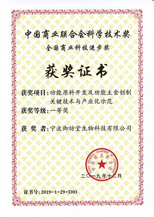在本次大会上,御坊堂荣获两项中国商业联合会科学技术奖,其中“功能营养物包埋载体设计技术及其健康产品应用”项目荣获2018年度“全国商业科技进步奖”一等奖,“功能原料开发及功能主食创制关键技术与产业化示范”荣获2019年度“全国商业科技进步奖”一等奖。