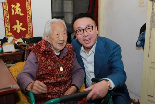 在101岁老人徐荷瑛的家中,徐建成董事长蹲下身来,亲切问候老人的身体状况和生活起居,表达了自己的敬意和关心。耳聪目明的徐荷瑛老人兴致高昂地介绍了自己的情况,为绿叶这样的苏州爱心企业高兴地鼓掌表示感谢。
