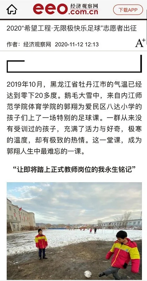11月3日,在2020“希望工程·无限极快乐足球”志愿者出征仪式上,郭翔作为无限极快乐足球2019年优秀志愿者代表,向老师和同学们讲述了自己在黑龙江支教的故事。曾在零下20多度的天气给小学生上的足球课给他留下深刻的印象,他说:“如果没有‘希望工程•无限极快乐足球’,我也许还不知道,在很多地区还有很多孩子,没有机会接触足球,无法体会到足球带来的快乐。正是因为遇见‘希望工程•无限极快乐足球’,我的人生有了更多可能,我支教的学校大部分学生是留守儿童,今后毕业我将继续投身支教事业,希望能给更多偏远山区的儿童带去知识和快乐。”现在他已圆满完成了2019年支教任务,获得无限极快乐足球2019年优秀志愿者的称号。