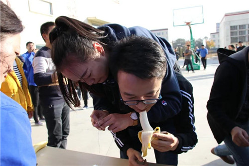跑起来,让青春绽放活力光彩,在8×50米的团队接力比赛中,速度带来的激情是不言而喻的,男女搭配共同争取这一份团队的荣誉,与时间赛跑,跑出我们的热情和状态。在“猪八戒背媳妇”的音乐伴奏中,令人捧腹的趣味项目“猪八戒背媳妇”开始了。只见一个个“猪八戒”背着“媳妇”飞奔去投篮,“你穿针来我吃香蕉”,比赛现场气氛热烈,妙趣横生。
