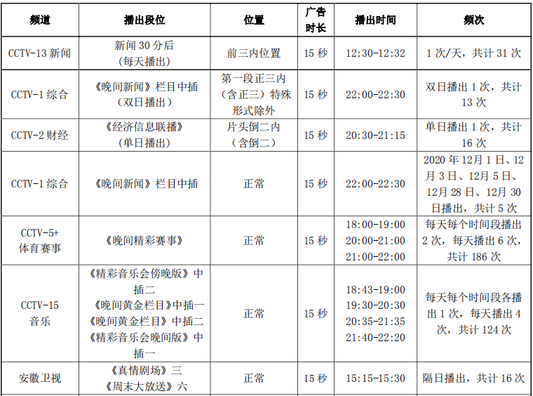 2020年12月,康美来芝蔻牌破壁灵芝孢子粉再次选入“精品安徽”央视品牌推广计划,这是康美来第三次荣登CCTV央视频道。本次推广广告将在CCTV-13新闻频道、CCTV-1综合频道《晚间新闻》、CCTV-2财经频道、CCTV-5+体育赛事频道、CCTV-15音乐频道、安徽卫视这六个频道播出。