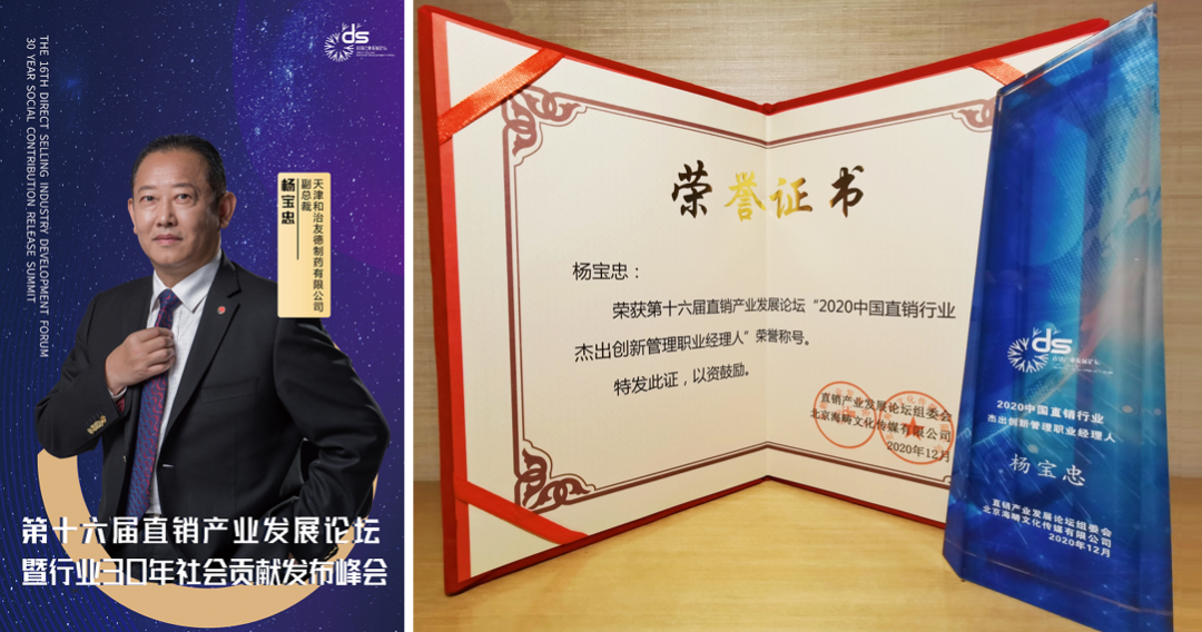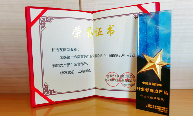 本次论坛颁奖盛典上,特别设置了中国直销30年系列奖项,为行业30年发展历程中做出非凡成绩的企业、从业者予以表彰。鉴于和治友德公司在全球大健康产业的强大影响力和对中国直销事业发展所做的诸多贡献,天津和治友德制药有限公司荣获“中国直销30年行业影响力企业”奖项,杨宝忠副总裁获得“2020直销行业杰出创新管理职业经理人”荣誉,和治友德口服液获得“中国直销30年行业影响力产品”奖项,巴志国部长获得“2020中国直销行业杰出培训师”荣誉。